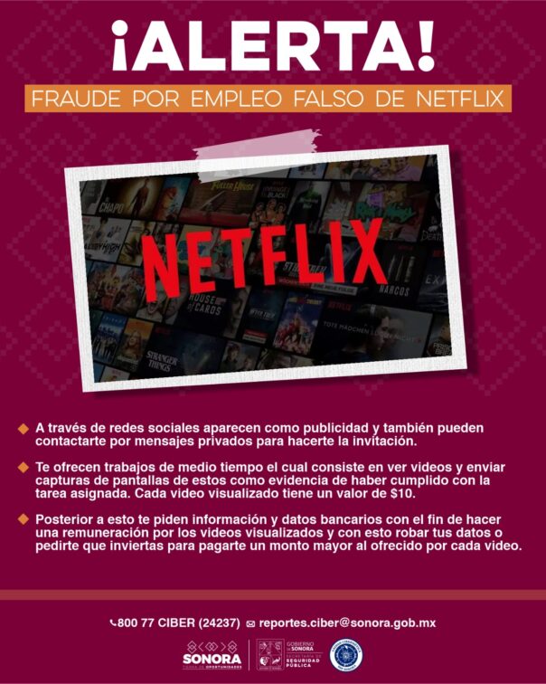 Hermosillo, Sonora; 17 de julio de 2025.- En labores de ciberpatrullaje en redes sociales, el Gobierno de Sonora identificó una nueva modalidad de fraude que oferta empleos falsos en nombre de la empresa Netflix, por lo que comparte recomendaciones para evitar ser víctima de este tipo de delitos.