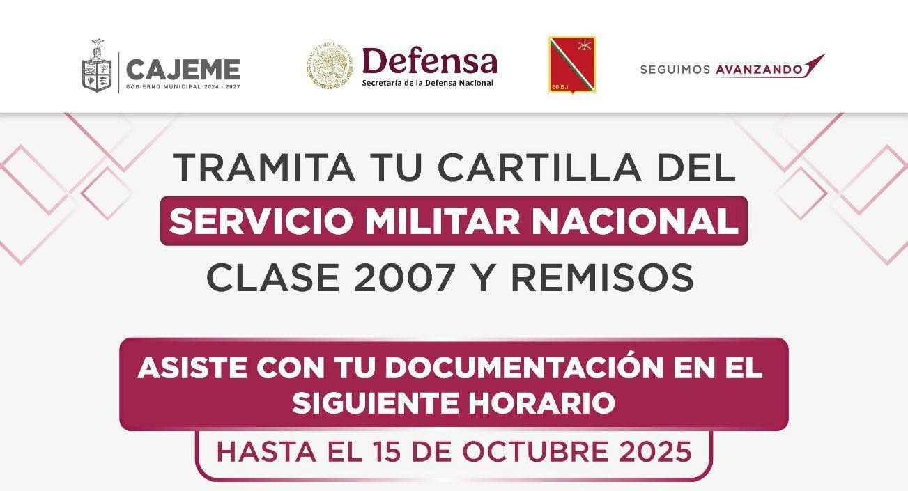 - La Junta Municipal de Reclutamiento del Ayuntamiento del #MunicipiodeCajeme informa a los jóvenes de la clase 2007 y remisos que el trámite para la Cartilla del Servicio Militar Nacional concluirá el próximo 15 de octubre de 2025, por lo que se invita a acudir lo antes posible con la documentación correspondiente.