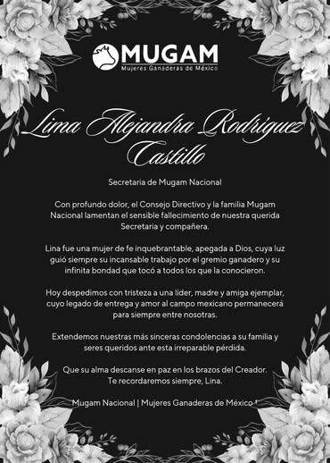 “Despedimos con tristeza a una líder, madre y amiga ejemplar, cuyo legado de entrega y amor al campo mexicano permanecerá para siempre entre nosotras. Extendemos nuestras más sinceras condolencias a su familia y seres queridos ante esta irreparable pérdida”, se apuntó en la esquela.