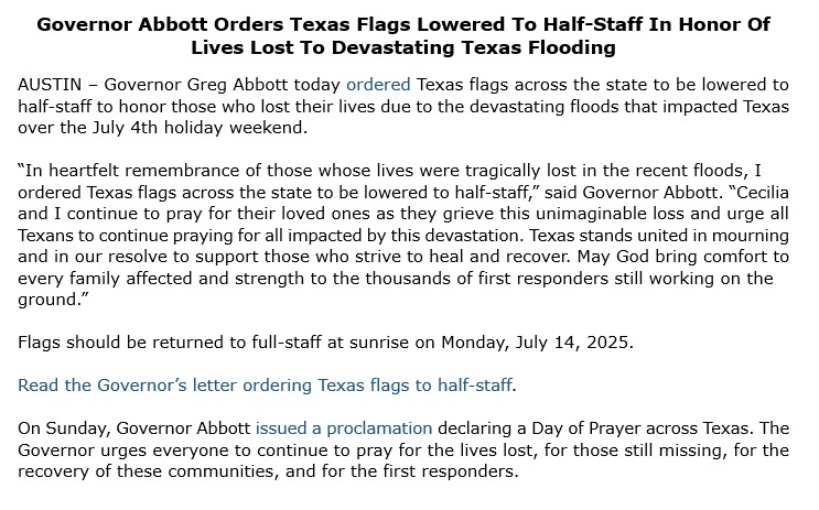 El gobernador de Texas, Greg Abbott, ordenó izar las banderas a media asta para guardar duelo por las más de 100muertes provocadas por las inundaciones en la región del Hill Country, a las afueras de San Antonio.