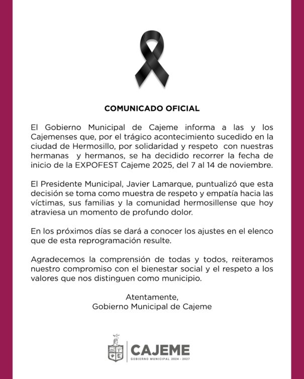 El Gobierno Municipal de Cajeme informa a las y los Cajemenses que, por el trágico acontecimiento sucedido en la ciudad de Hermosillo, por solidaridad y respeto con nuestras hermanas y hermanos, se ha decidido recorrer la fecha de inicio de la EXPOFEST Cajeme 2025, del 7 al 14 de noviembre.
