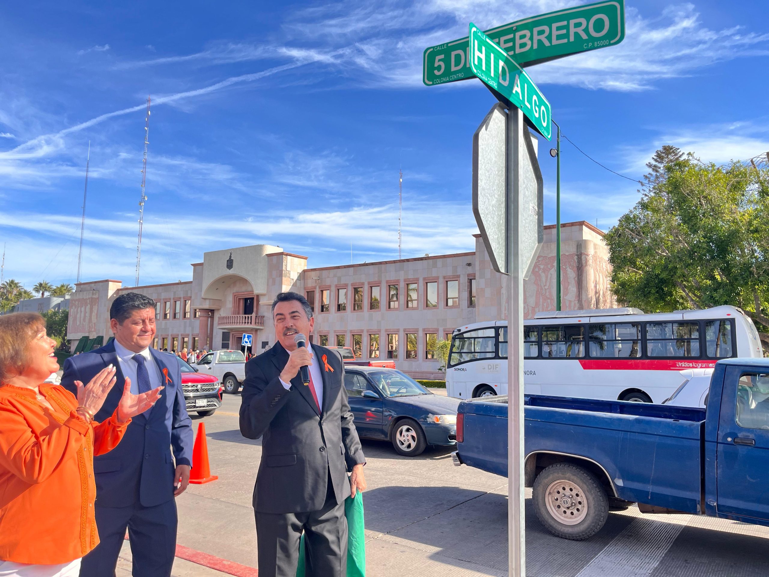 Con el propósito de mejorar la identificación de las calles y fortalecer la infraestructura urbana, el Presidente Municipal de Cajeme dio inicio formal al programa intensivo de colocación de nomenclaturas, con la develación de las primeras placas instaladas en el crucero de las calles Hidalgo y 5 de febrero, justo bajo el icónico reloj frente al Palacio Municipal.