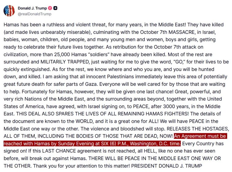 «Se debe llegar a un acuerdo con Hamás el domingo por la noche a las SEIS (6) de la tarde, hora de Washington, D.C.», escribió Trump el viernes en las redes sociales. «¡Todos los países han firmado! Si no se alcanza este acuerdo de ÚLTIMA OPORTUNIDAD, se desatará un INFIERNO como nunca antes se ha visto contra Hamás. HABRÁ PAZ EN ORIENTE MEDIO DE UNA FORMA U OTRA».