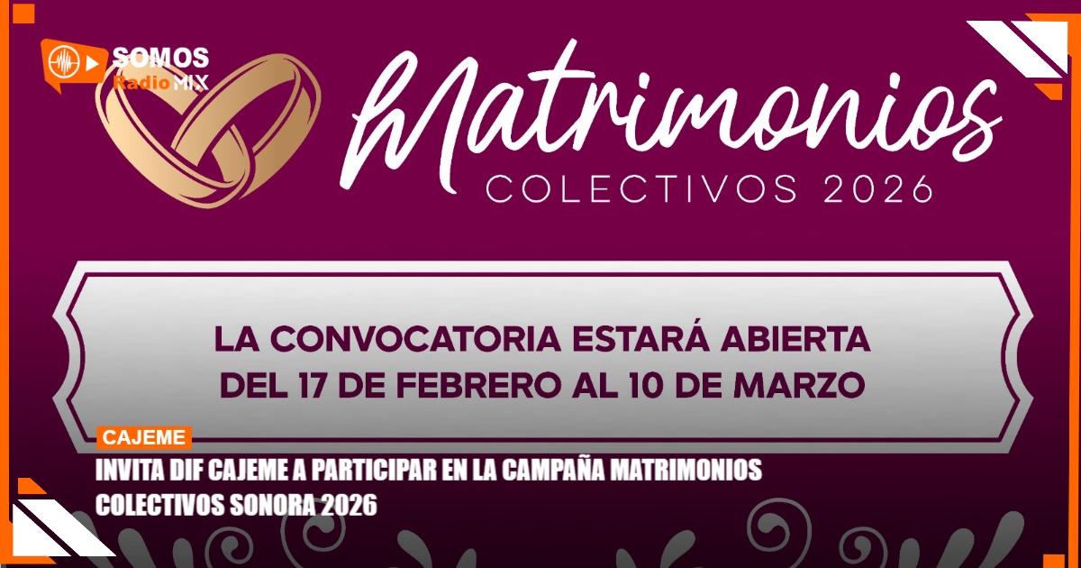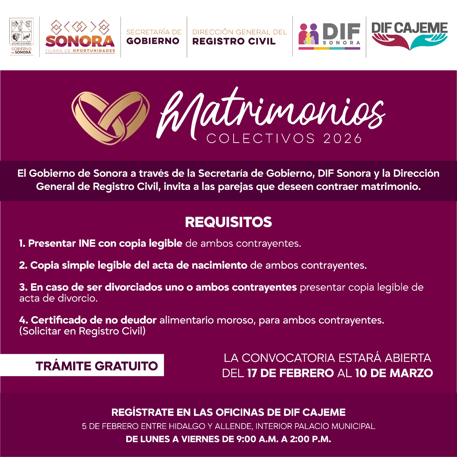 El Gobierno de Sonora, a través del Sistema DIF Municipal en coordinación con la Dirección General del Registro Civil, invita a todas las parejas a participar en la campaña Matrimonios Colectivos Sonora 2026, una iniciativa que tiene como objetivo brindar certeza jurídica a las familias y fortalecer el bienestar social mediante la formalización de la unión civil.