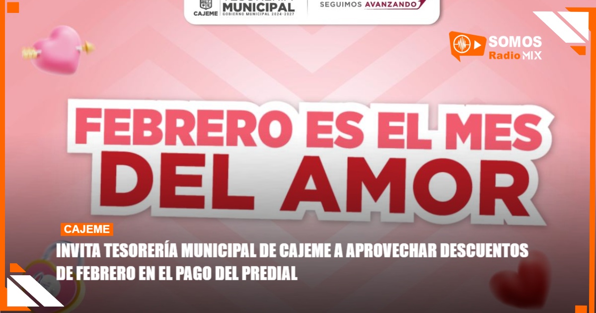 Con la finalidad de apoyar la economía familiar y fomentar el cumplimiento oportuno de las contribuciones municipales, el Gobierno de Cajeme, a través de Tesorería Municipal, invita a las y los cajemenses a aprovechar los descuentos especiales disponibles durante el mes de febrero en el pago del impuesto predial.