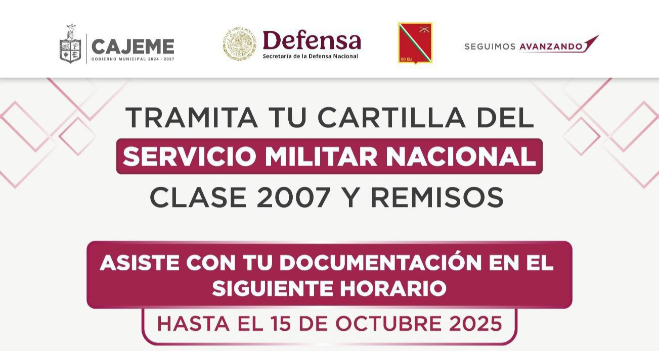 El Gobierno Municipal de Cajeme, en coordinación con la Secretaría de la Defensa Nacional (SEDENA), invita a los jóvenes clase 2007 y remisos a tramitar su Cartilla del Servicio Militar Nacional antes del 15 de octubre de 2025.