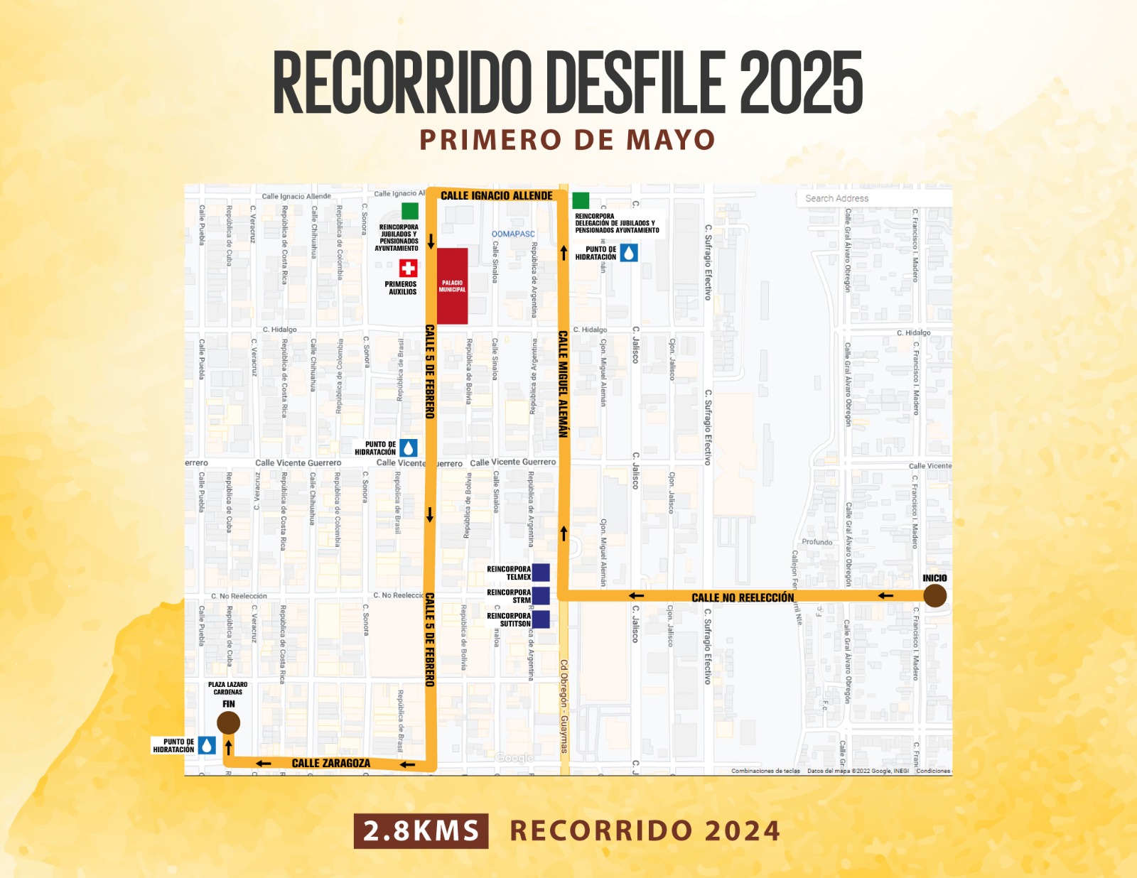 Explicó que el recorrido del desfile será por la calle No Reelección rumbo al poniente para después girar hacia el norte por la avenida Miguel Alemán, continuando por la calle Allende hasta la 5 febrero, pasando por Palacio Municipal donde se contará con la presencia del Alcalde y autoridades, finalizando por la Zaragoza en la plaza pública Lázaro Cárdenas.