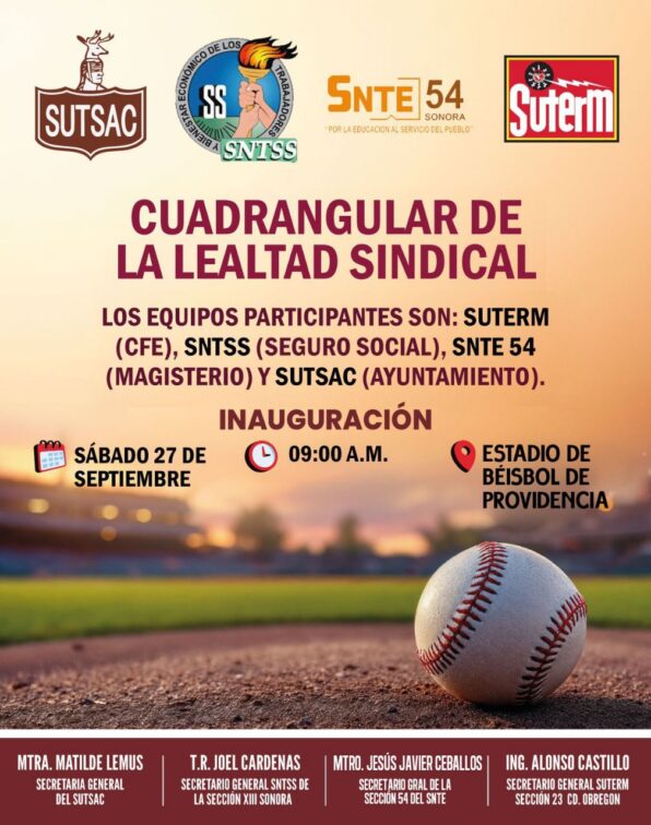 Con la finalidad de estrechar lazos de amistad y generar entornos de bienestar social para las y los agremiados a las diferentes organizaciones sindicales del municipio, el Ayuntamiento de Cajeme a través del Instituto del Deporte Municipal, en coordinación con el SUTSAC, invitan al Cuadrangular por la Lealtad Sindical, mismo que tendrá lugar este sábado 27 del presente en el estadio de béisbol de Providencia.