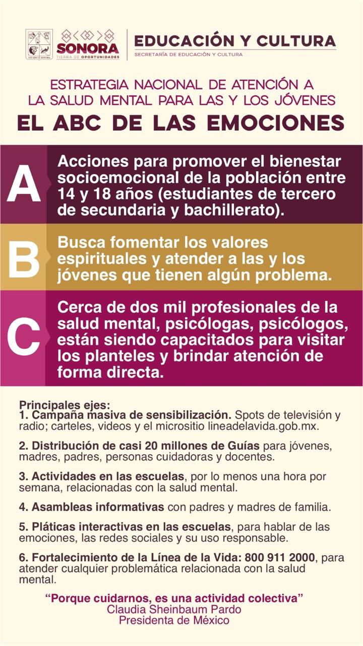 Por otra parte, mencionó la importancia de iniciativas como la Estrategia Nacional de Atención a la Salud Mental para las y los Jóvenes. El ABC de las Emociones, anunciado por la presidenta de México, Claudia Sheinbaum, misma que contará con todo el respaldo del gobernador Alfonso Durazo.