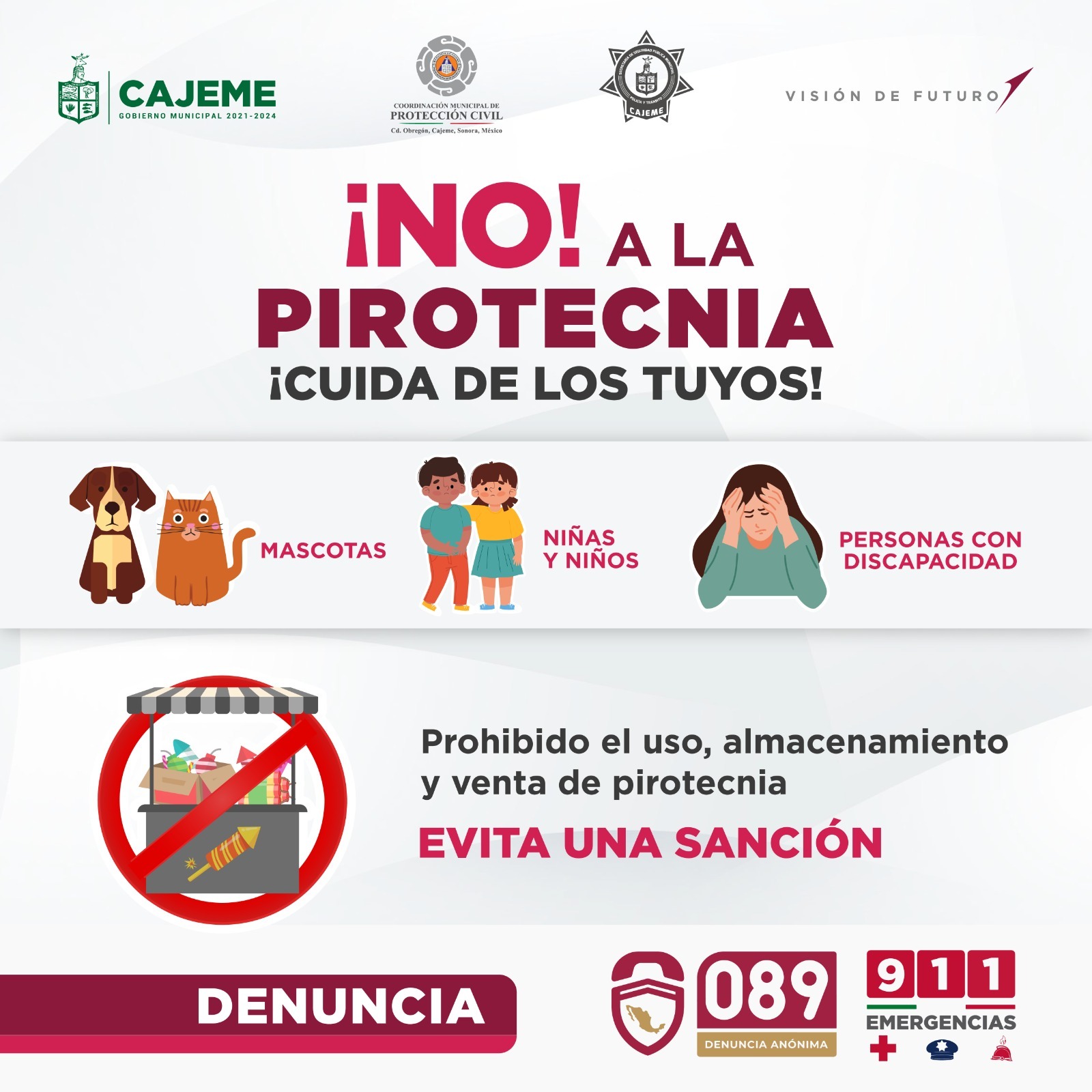 Para sancionar a quienes incumplan con la normativa y disposición del Ayuntamiento de Cajeme, sobre la prohibición del uso, venta, compra, almacenamiento y traslado de pirotecnia, la Secretaría de Seguridad Pública Municipal hace un llamado a las y los ciudadanos a denunciar cualquier tipo de caso al número de emergencias 911 o de manera anónima al 089.