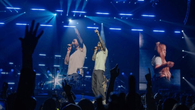 La banda californiana, encabezada por Adam Levine, encendió el escenario con clásicos como «This Love», «Animals», «Stereo Hearts» y «One More Night», en un espectáculo que mantuvo la energía al máximo.