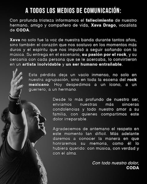 Xava Drago, vocalista de Coda, falleció tras padecer cáncer de estómago, el cantante estuvo en contacto con sus fans durante los meses recientes, tiempo en el que detalló su delicado de salud, se despidió y hasta anunció un nuevo disco.